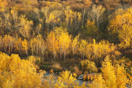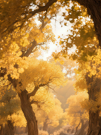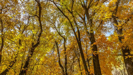 The golden leaves of poplar(Huyang) trees look like plants in an oil painting. Golden yellow forest. diversifolious poplar(Populus diversifolia). Xinjiang, China. Sep. 2018