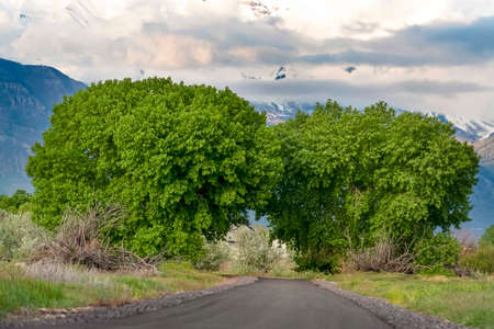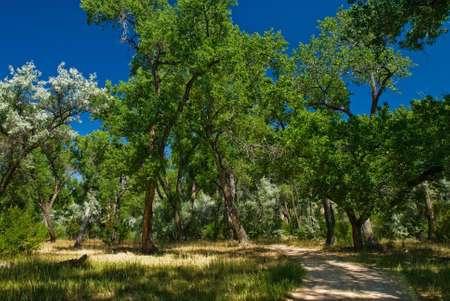 Large Cotton Tree provides shade in winery grounds in Palisade, Colorado on clear sunny summer morning.