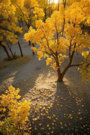Tarim Huyan Lin Scenic Area in Luntai County, Xinjiang, when the leaves of the Hu Yanglin change color, it appears as a golden yellow. which means the most beautiful tree,