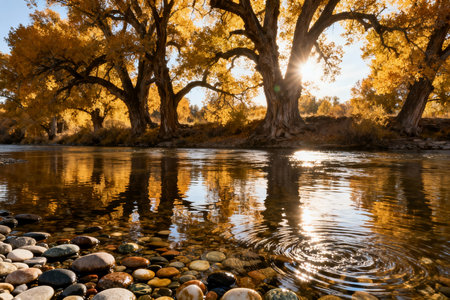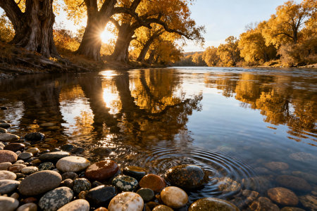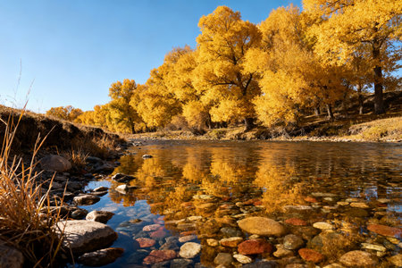 Beautiful autumn scenery with yellow trees on the banks of the river, fall season outdoor theme with atmosphere