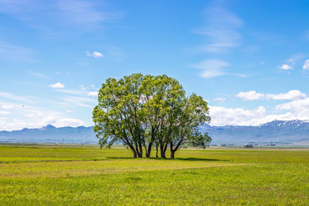 A serene image of a lone tree in spring in Erzurum, Turkey. Vast blue sky and green fields create the perfect space for text, ideal for wallpapers and backgrounds.