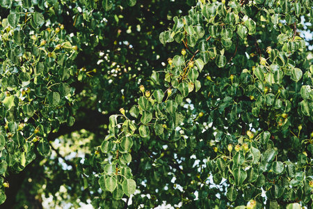 Green leaves of poplar tree in sunlight, Summer green foliage, Chlorophyll production, Poplar twigs with green leaves in sunshine.