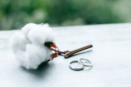 Fluffy cotton ball of cotton plant on the wooden table, macro, closeup