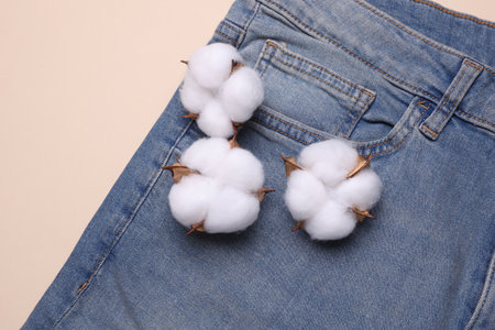 Branch with white cotton flowers on blue background. Natural organic fiber, agriculture, cotton flower, raw materials for making fabric. Backdrop, mockup with copy space for text