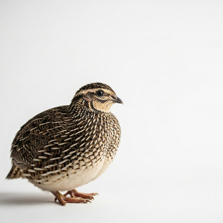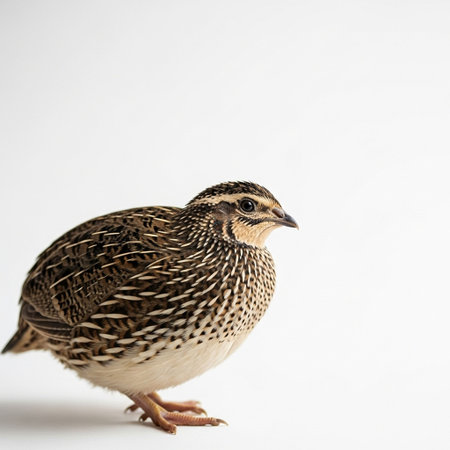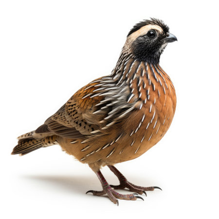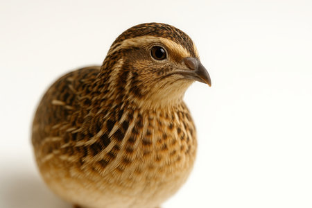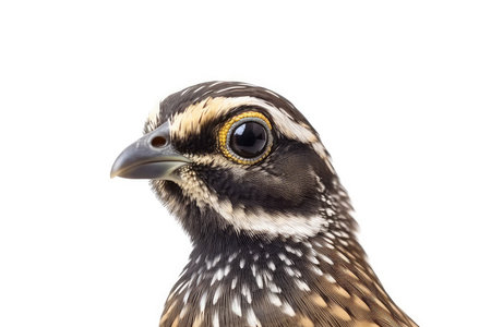 Wild common quail close portrait of head and upper body leaning slightly forward crisp eye detail clean wildlife studio on white