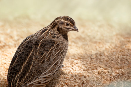 The common quail (Coturnix coturnix) or European quail extra close up portrait. The identifications signs of the bird and the structure of the feathers are clearly visible.