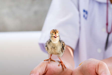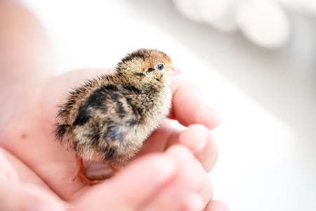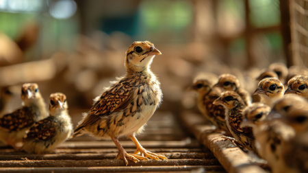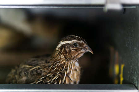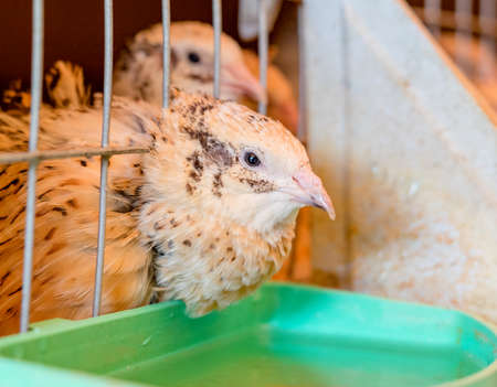 Close-up view of quails chicks in a cage on the farm. Coturnix japonica. Shallow depth of field.
