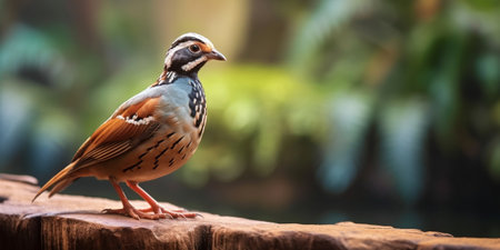 A quail stands calmly, displaying its detailed plumage and unique features. The bird is set against a plain backdrop, highlighting its intricate markings.