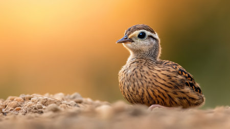 A solitary bird stands on a rocky path bathed in warm sunset light, highlighting the intricate details of its feathers and the serene environment around it.