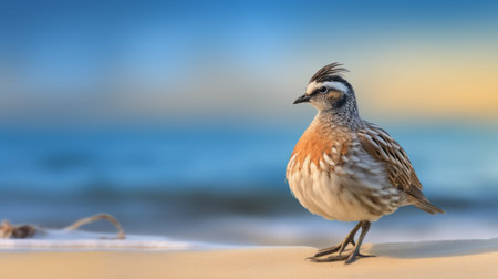 a vibrant, high-energy 8k resolution photo by john wilhelm featuring a bird on a beach next to the water. the image showcases a shallow depth of field, capturing the light brown and navy tones of the bird's feathers. this captivating shot is reminiscent of the characterized animals often depicted in the works of peter paul rubens. ai generated