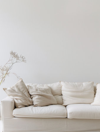 A white sofa with plush pillows sits in a minimalist living room, with dried flowers on the table in front of it.