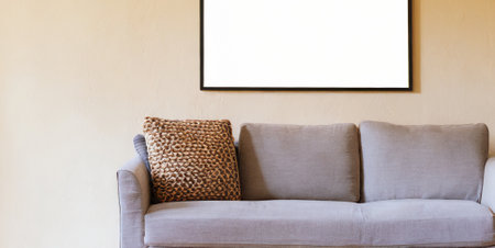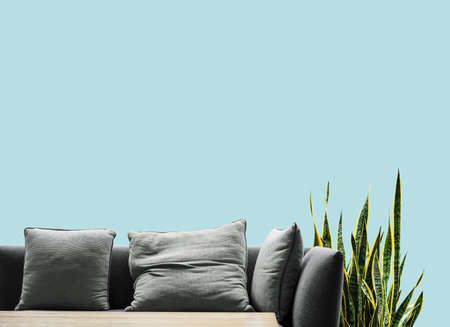 Minimalist grey sofa with blanket on light blue background perfect for web banner design