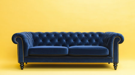 A stunning blue velvet sofa with a tufted design set against a bright yellow background, ideal for enhancing modern living spaces and creating stylish atmospheres.