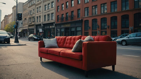 A Bright Red Vintage Couch Placed on an Empty Urban Street in the Late Afternoon.