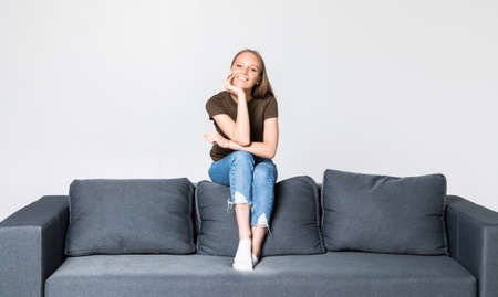 woman sits on sofa at modern home and relaxes on white background with arms rest on couch and looks to the right side