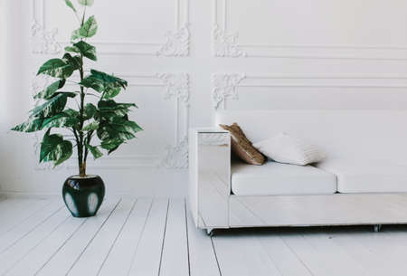 Element of a stylish beige sofa with a white fluffy pillow against a white wall background