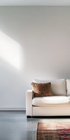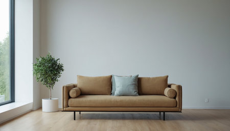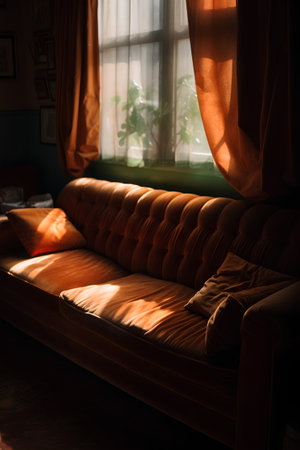 A cozy sofa adorned with soft cushions is bathed in gentle sunlight, creating a warm and inviting atmosphere perfect for relaxation in modern interiors.