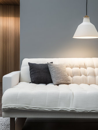 A cozy living room features a white tufted sofa adorned with two decorative pillows. A sleek pendant light hangs above illuminating the space complemented by warm wooden accents.