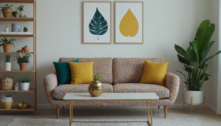 A cozy living room featuring a vibrant pink sofa, artistic wall decor, and lush plants, creating a welcoming atmosphere perfect for relaxation and inspiration.