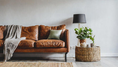 Living room interior with sofa and pillows. Place for relax at home. Cozy modern apartment. Created with Generative AI