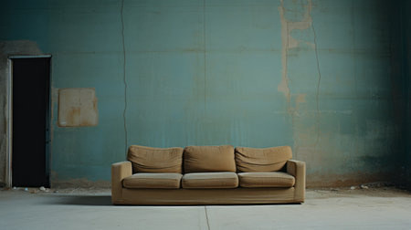 an old door, in the style of dark beige and aquamarine, stands near a couch in an empty room. the minimalist background adds to the urban industrialism vibe. the ceramic texture of the door gives it a tangible feel. this photo, captured by vincent lefevre, showcases the unique combination of colors and textures. ai generated