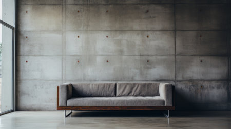 a gray couch is placed in front of concrete walls and windows, showcasing an elegant and minimalist design. this luxurious piece of furniture complements the industrial and product design elements of the space. the color scheme, consisting of gray and brown, adds an elegantly formal touch to the overall aesthetic. ai generated
