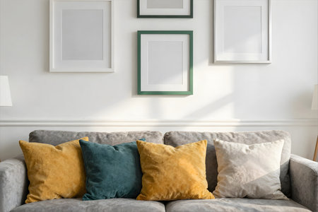 Interior of living room with gray sofa, colorful pillows and picture frames