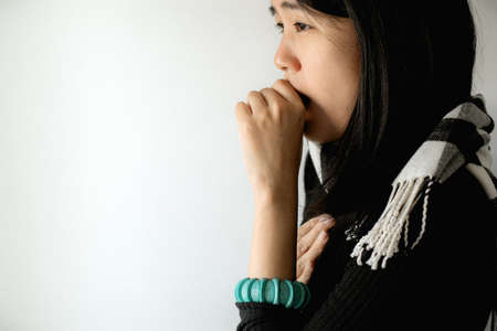 Asian woman coughing with sore throat,Female suffering with cough a lot on white background