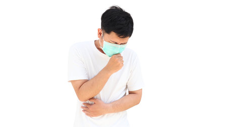 Asian boy with protective mask coughing on white background. Concept of Coronavirus epidemic