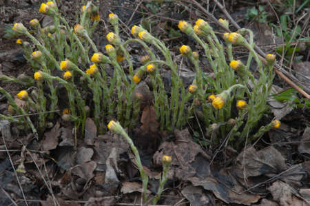 Coltsfoot (Tussilago farfara) blooming in the woods