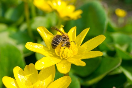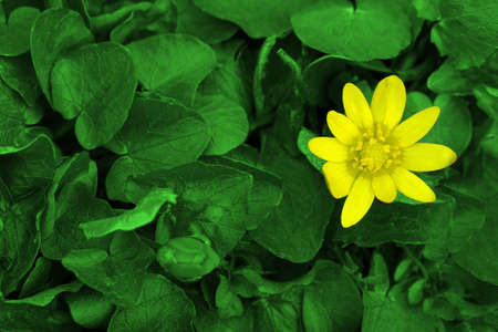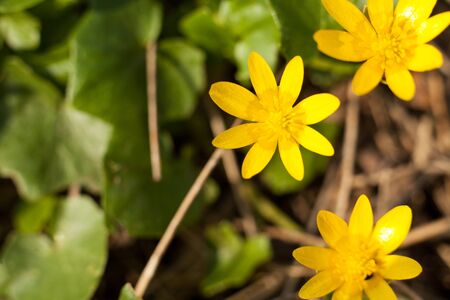 The first spring yellow flowers with green leaves are Fig Buttercup from ficaria verna. Floral spring background.