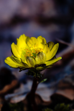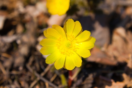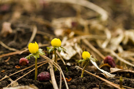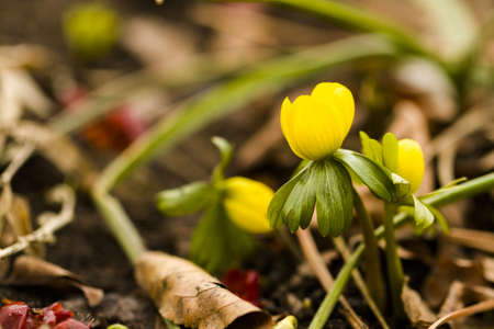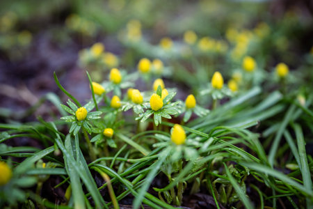 Closeup of yellow Eranthis hyemalis blooming in public park, soft focus, blurred background. Spring.
