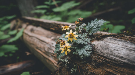 Delicate yellow flowers emerge from the weathered surface of a decaying log.