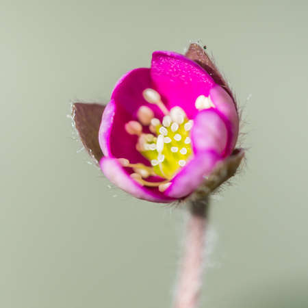 A macro shot of a pink hepatica noblis bloom just starting to open.