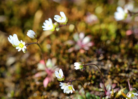 Blooming Golden Saxifrage Chrysosplenium alternifolium with soft edges. selective focus. Has healing properties. Yellow spring small flowers.