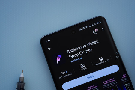 Dhaka, Bangladesh- 29 May 2025: On a blue surface, a smartphone displays the Robinhood Wallet app within the Google Play Store.