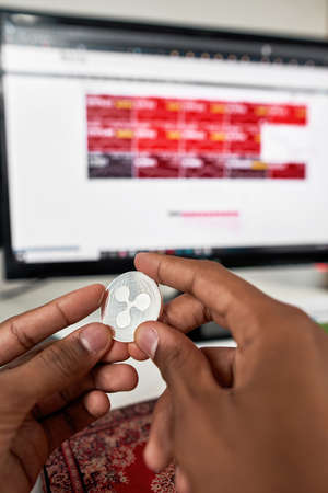 Close up of hands of stock trader holding Ripple XRP cryptocurrency token, making money with initial coin offering, while trading using pc from home