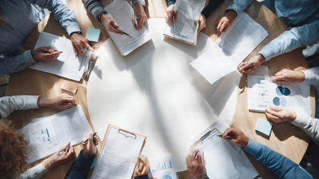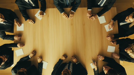 Top view of business diverse people and meeting team at desk, Aerial view of header or banner businessman and businesswoman sitting around a conference table