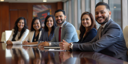 Business meeting in a modern conference room with professionals discussing strategies around a large table