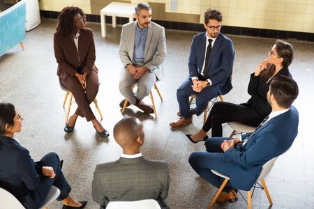 High angle view on rebellious teenagers in group therapy and a middle-aged man psychologist listening and giving professional advice