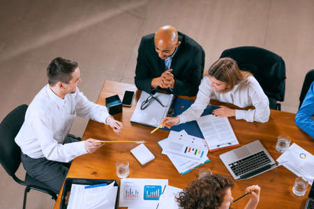 Training new employees. Aerial view of young multiethnic people talking, working with colleagues, co-workers at office, indoors. Work, finance, tech concept.
