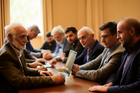 A community of individuals is gathered around a table in a building, sharing laptops and engaging in a real estate conference. AIG41