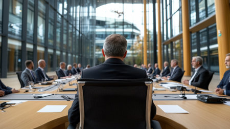 Top-down view highlights the organized layout of parliamentary seating with microphones, reflecting an institutional atmosphere conducive to discussions.