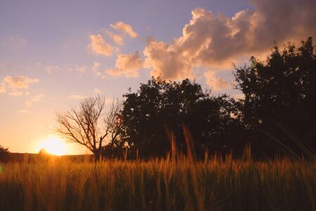 Colorful sunset over wheat field with lens flare. Summer sunset.
