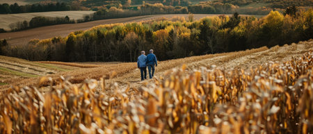Farmer and farmer walk across a field and discuss business