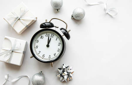 Flat lay composition with alarm clock and Christmas decorations on white background.
