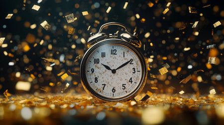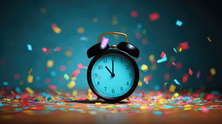 A striking image featuring an alarm clock amidst a shower of colorful confetti, perfect for representing celebration, countdown events, or festive occasions.