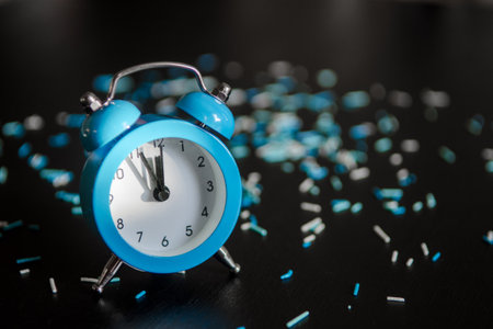 Classic arrow blue alarm clock on a black background and blue sprinkles, time to celebrate