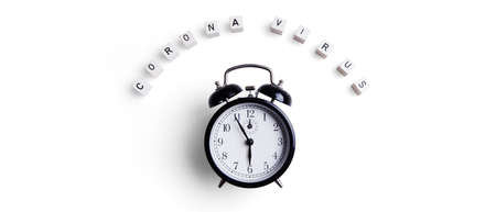White retro alarm clock isolated on double white and black background with copy space