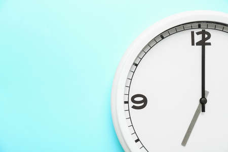 Stylish analog clock hanging on light blue wall